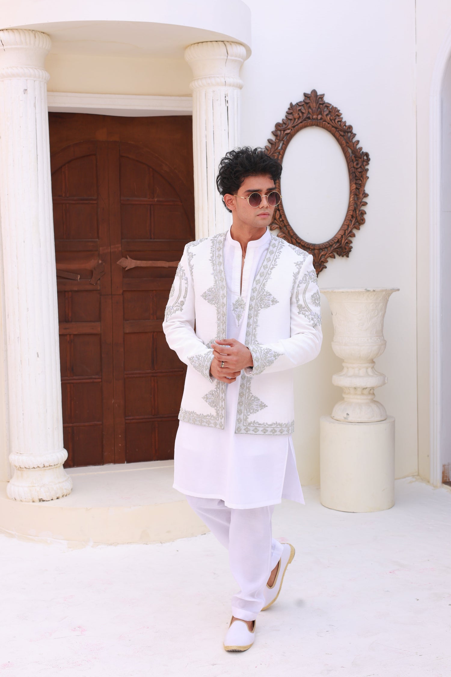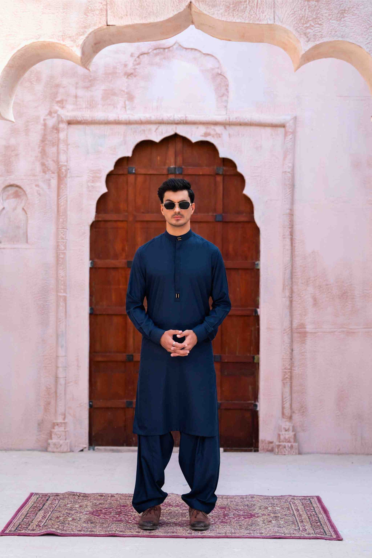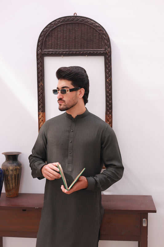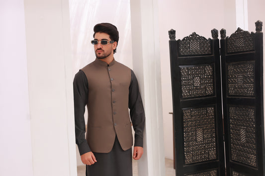 Beige Stitched Shalwar Kameez – Sherwani Collar with Metal Buttons