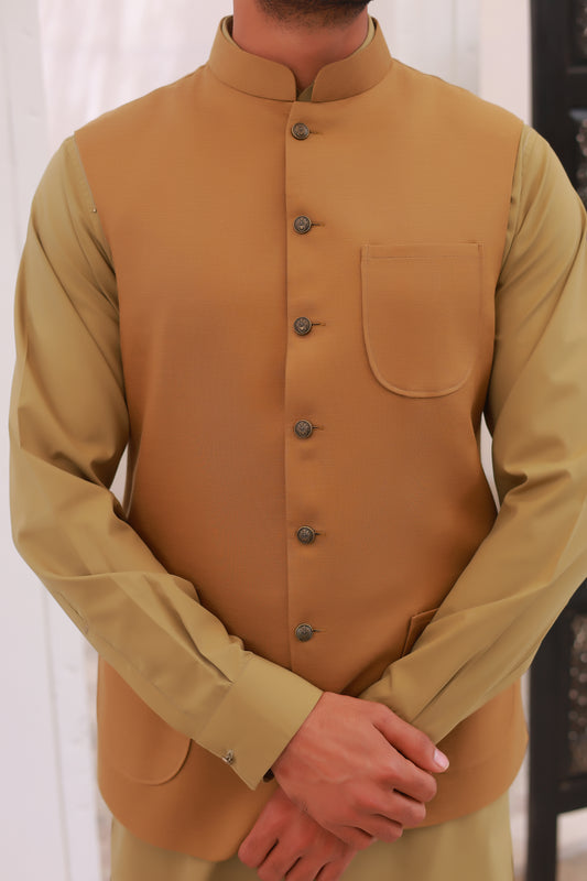 Tan Georgette Waistcoat – Modern Fit with Metallic Hardware