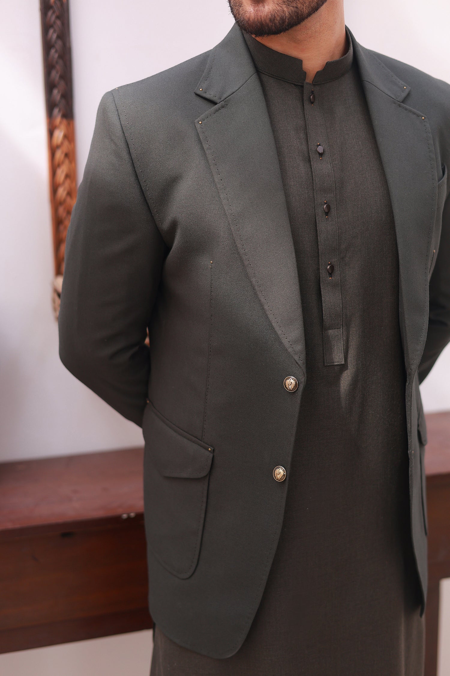 Army Green Studded Blazer with Hand-Stitch Detailing
