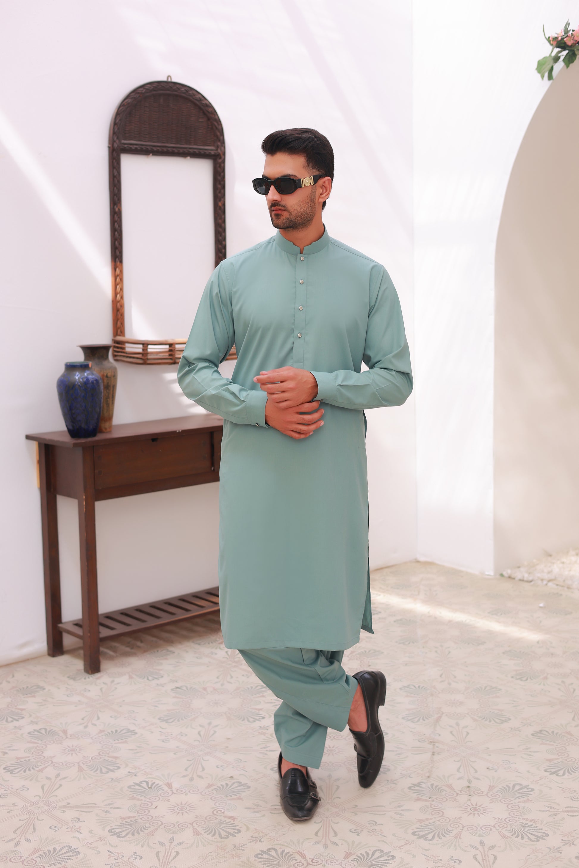 This Sea Green Kameez Shalwar offers a refreshing and modern look for any occasion. The outfit features a clean Mandarin collar for a sleek, contemporary feel, accented by high-quality metal buttons on the front placket. This fully stitched, ready-to-wear ensemble provides a tailored fit that balances traditional style with updated details.