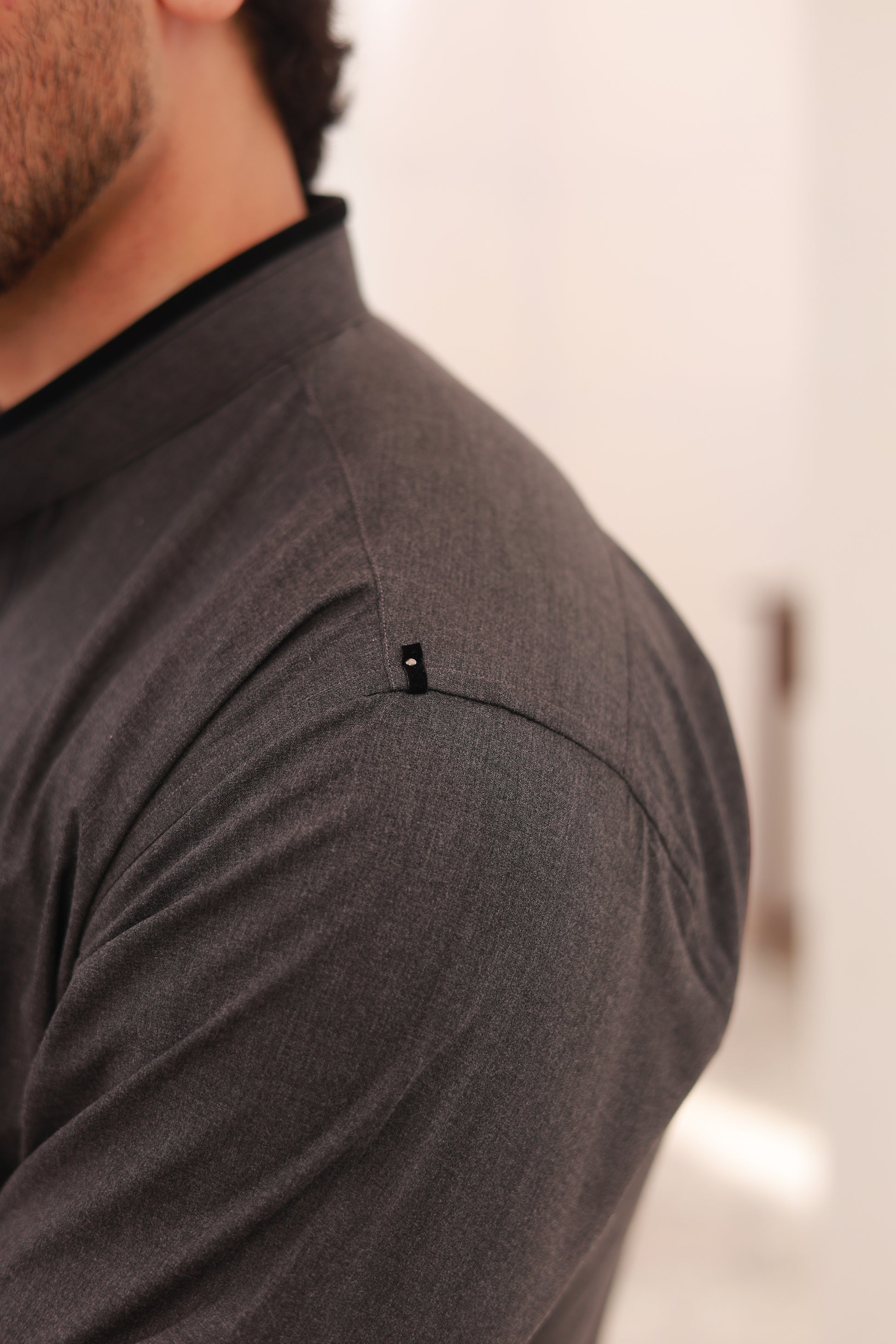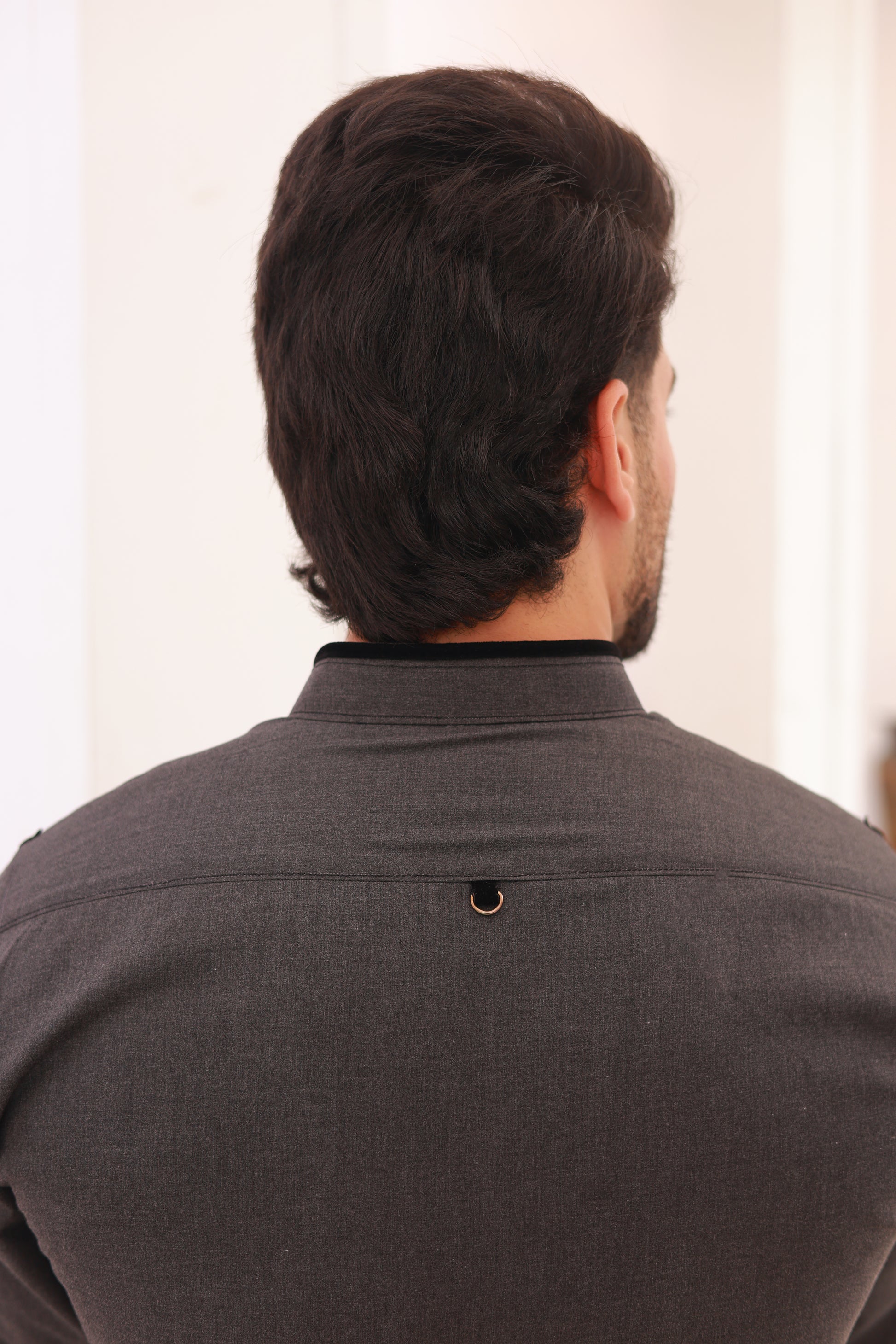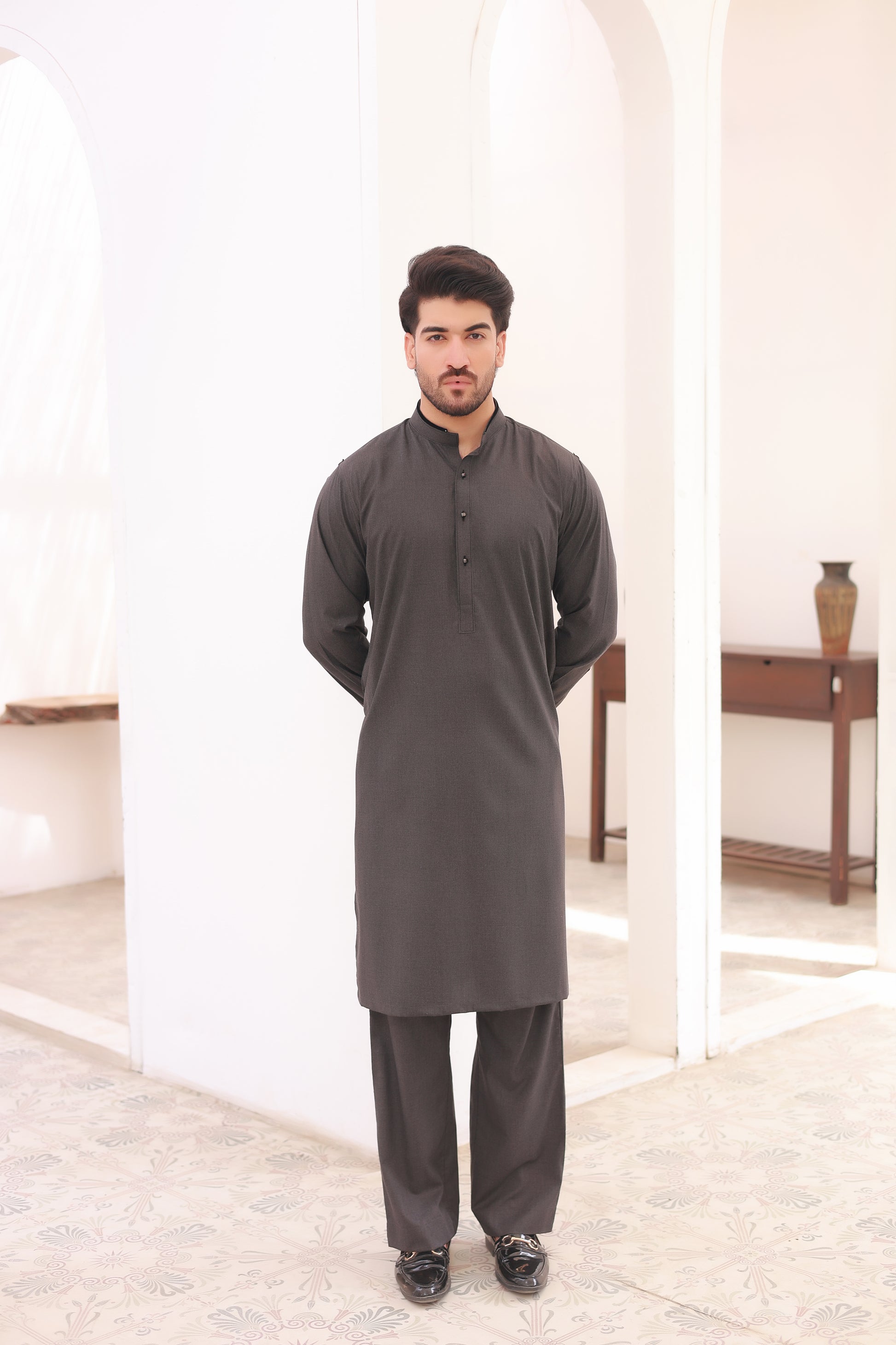 This Gray Self-Textured Kameez Shalwar is designed for those who appreciate subtle luxury. The "Self" fabric provides a sophisticated tonal pattern that adds depth to the outfit, while the Velvet piping on the collar offers a soft, high-end contrast. Finished with polished metal buttons, this stitched ensemble is a perfect blend of modern texture and traditional elegance.